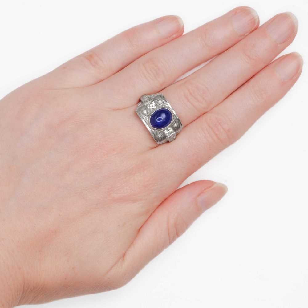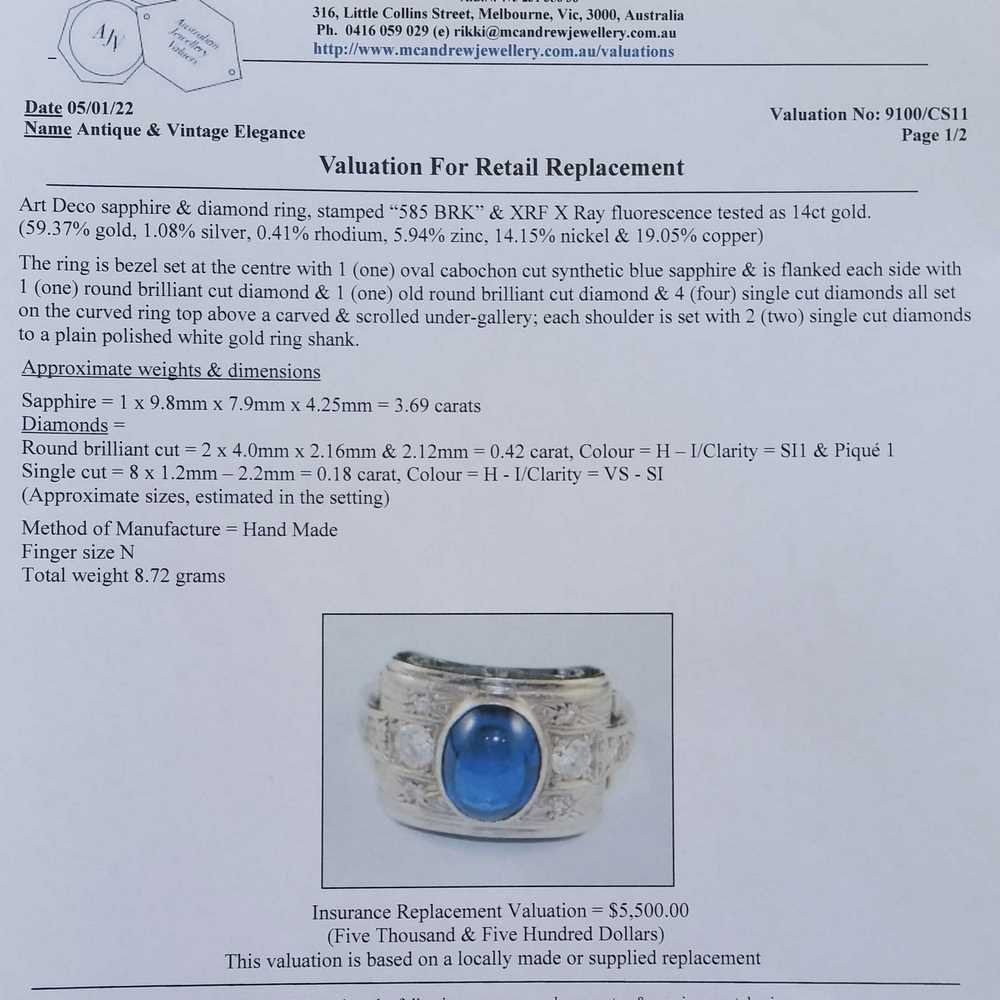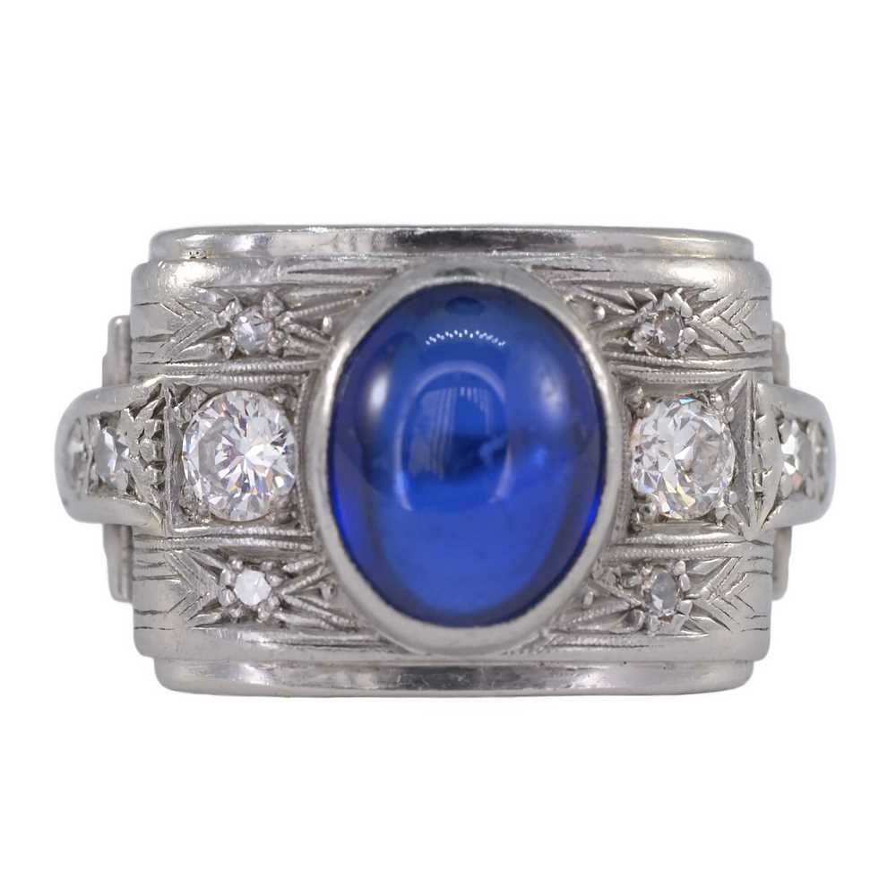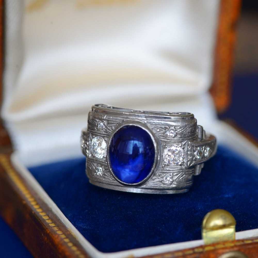 European made, it likely dates to the 1930s and is in very good vintage condition. Minor scuffs to the sapphire, visible with a loupe under 10x magnification, are not noticeable by eye.