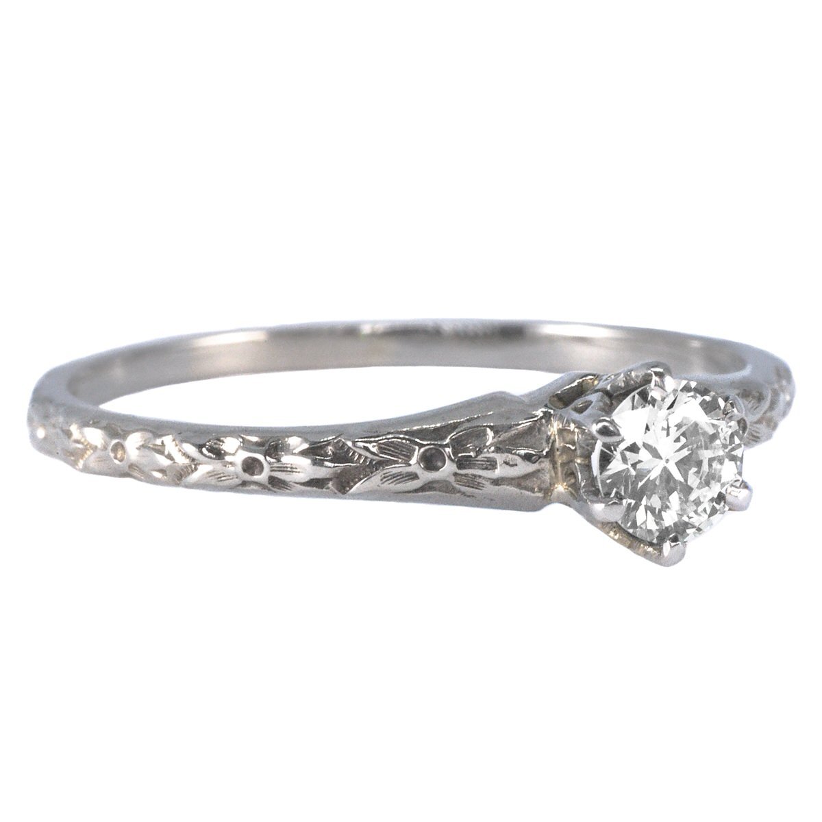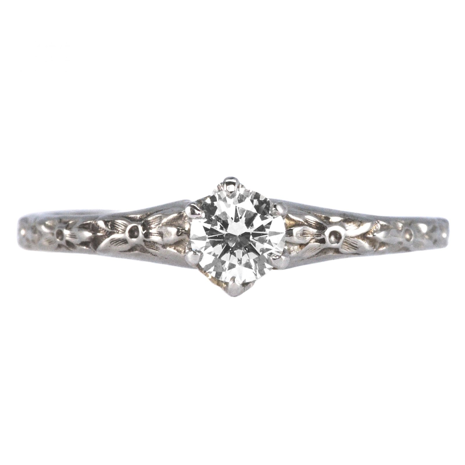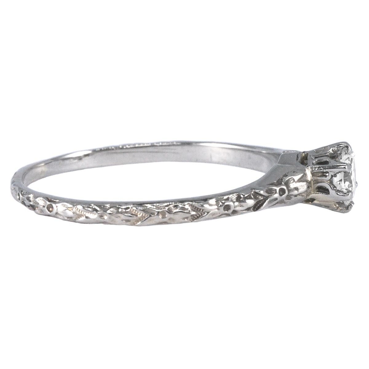 The 18ct white gold band features a pattern of raised orange blossoms all the way around. A popular bridal motif in Victorian times, orange blossoms were also frequently used in Art Deco jewellery.