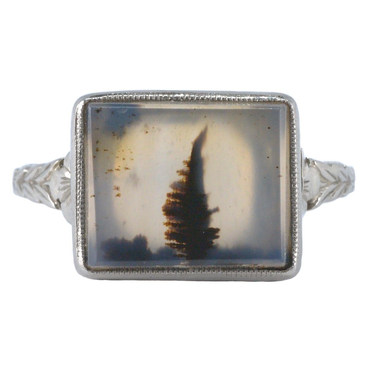 The wonderful thing about dendritic agate is that no two specimens are the same, making for some marvellous and truly unique pieces of jewellery. For this ring, the jeweler has cleverly chosen a tablet of agate that seems to depict a lone pine in a misty forest, a cloud of birds circling in the distance. Charmingly atmospheric!