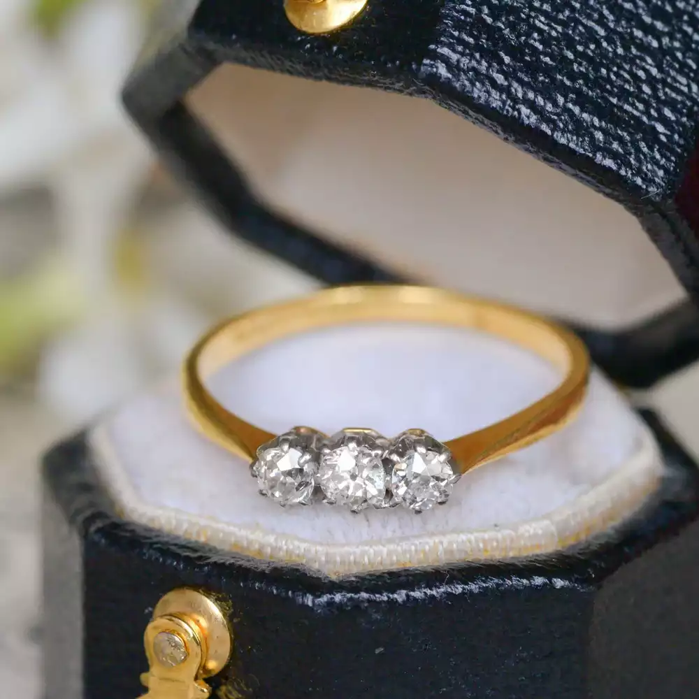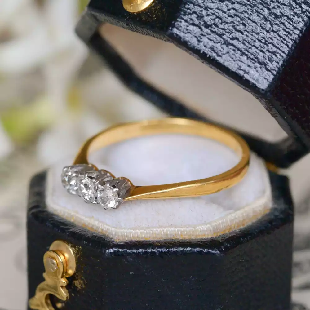 The 3 old-cut diamonds total 0.28ct, their hand-cut facets creating such unique sparkle! They are claw-set in platinum coronet settings, flanked by elegant knife-edge shoulders which taper to a plain band at the rear.