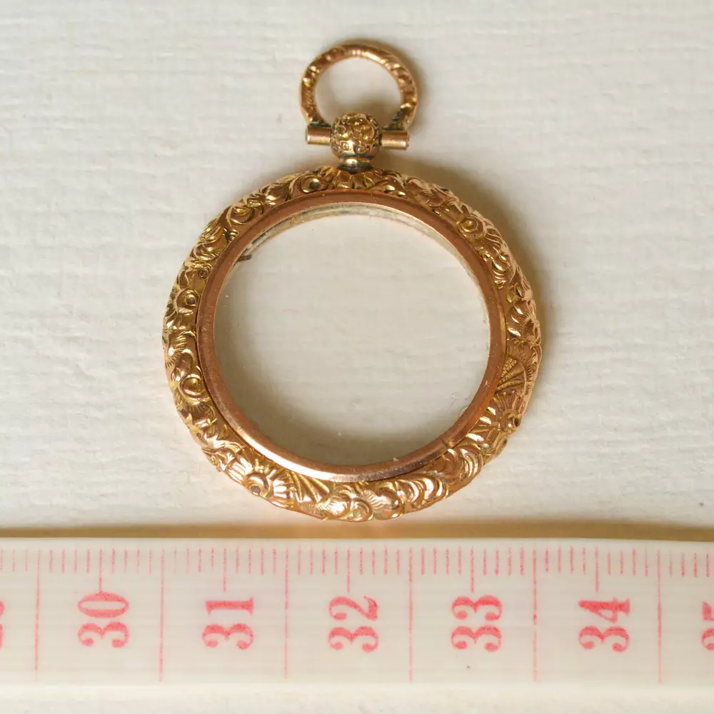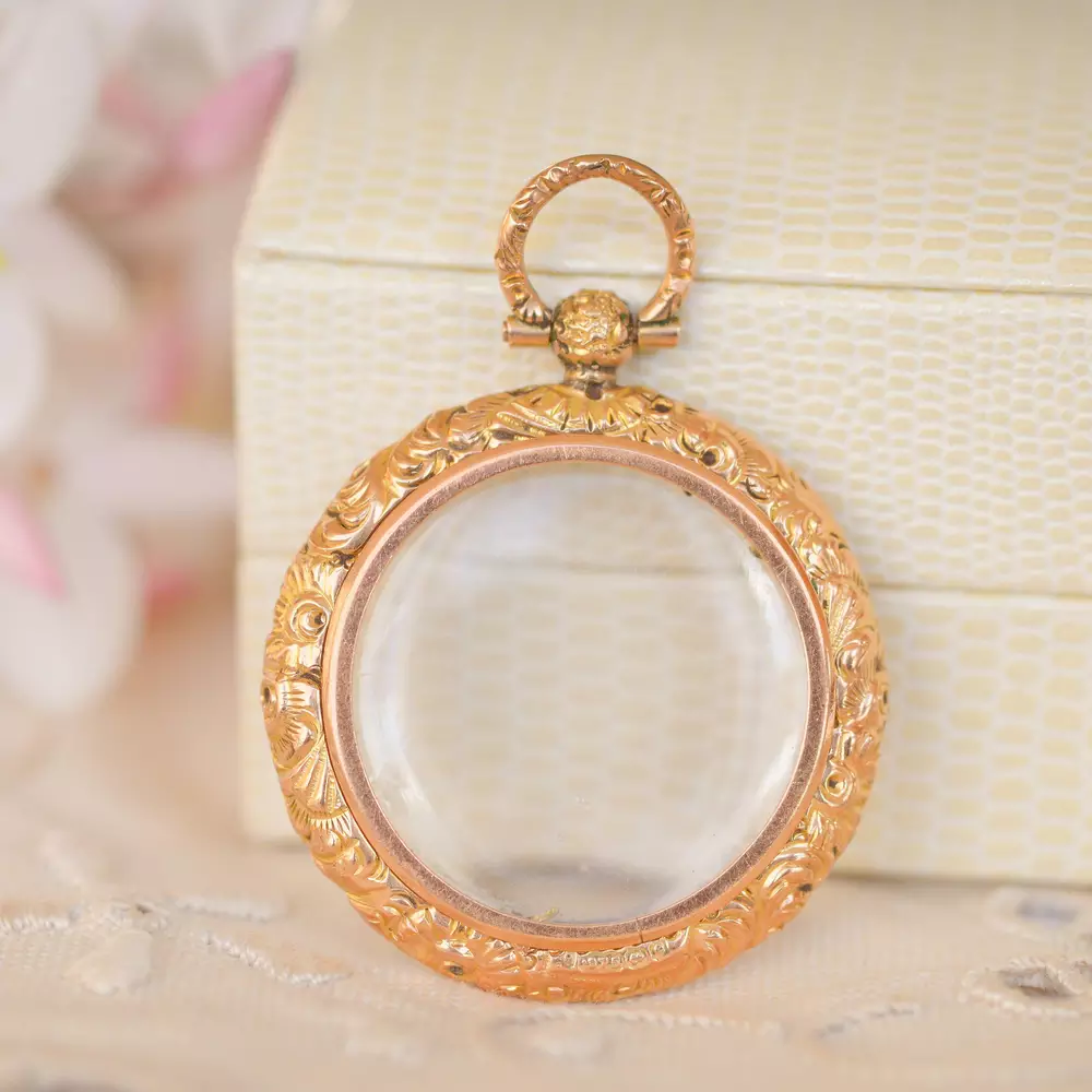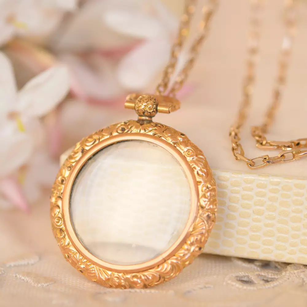 Crafted in a lusciously rosy 9ct yellow gold, it is designed as a pocket watch style pendant, decorated with beautiful floral repousse work.