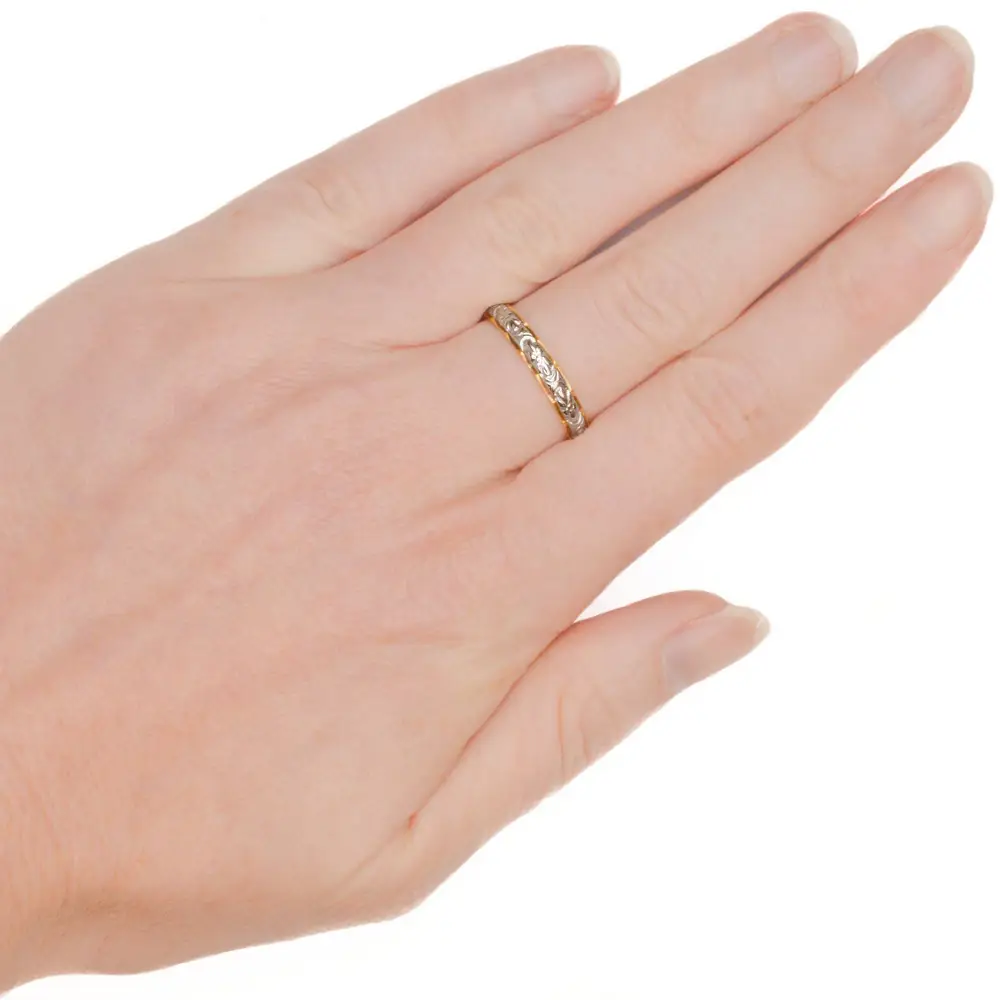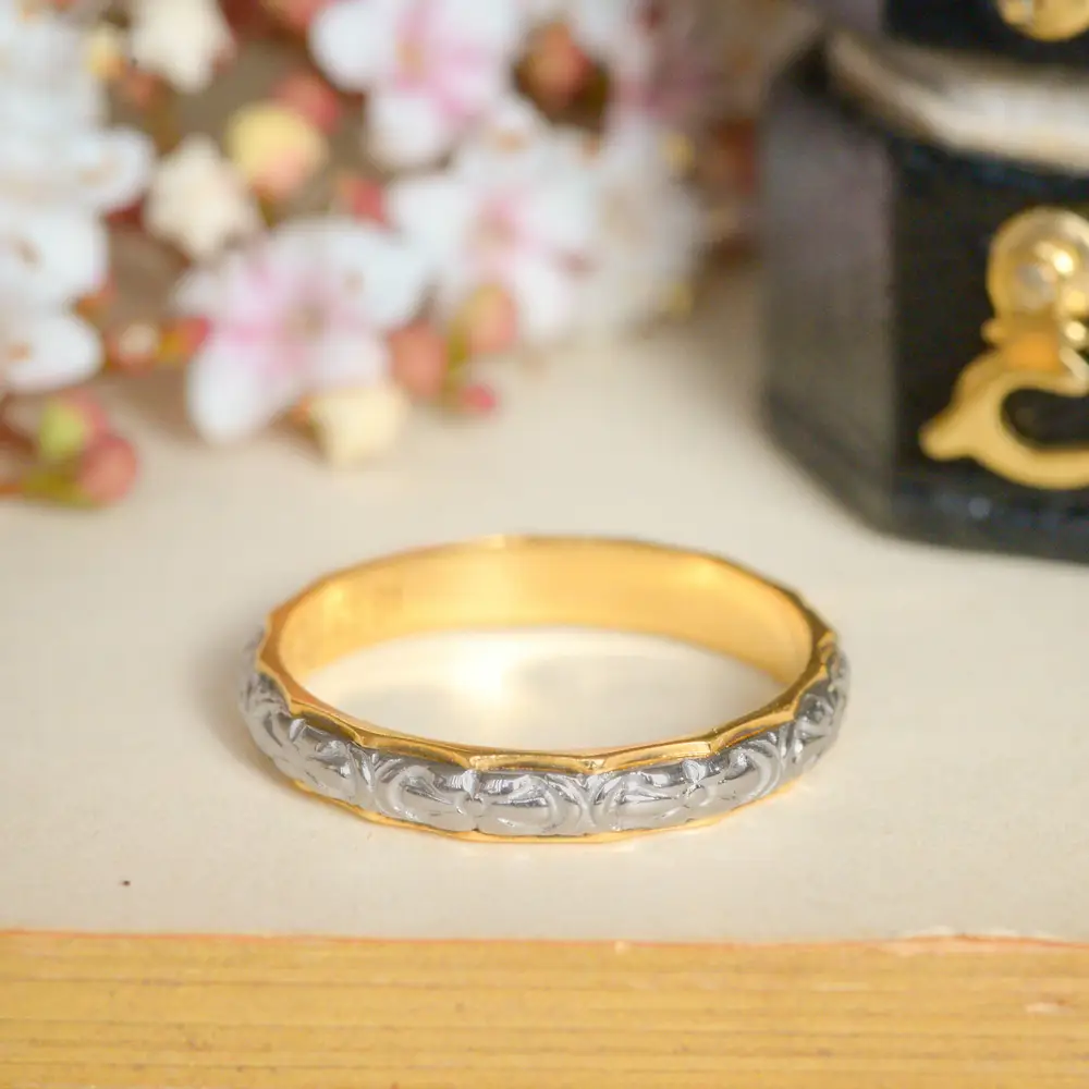 It features a central floral designed band of palladium, set within a wider border of contrasting 18ct yellow gold, with decoratively scalloped edging to catch the light. Palladium is a precious white metal similar to platinum that has been used in jewellery since the late 1930s.
